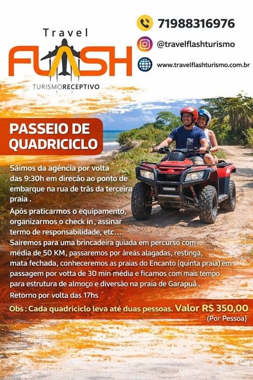 🚀 Sinta a liberdade, viva a aventura! Que tal trocar o comum por uma experiência inesquecível em meio às belezas naturais do litoral baiano? O passeio de Quadriciclo em Morro de São Paulo é pra quem quer mais do que só conhecer… é pra quem quer sentir cada momento! Imagine você acelerando por trilhas incríveis, passando por áreas alagadas, restinga e mata fechada. Tudo isso enquanto explora praias paradisíacas, como a do Encanto, e faz uma parada especial em Garapuá para curtir, relaxar e almoçar.